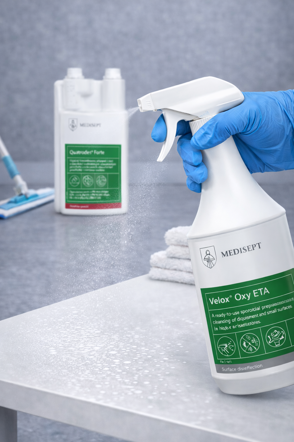 - Velox® Oxy ETA – přípravek na bázi peroxidu vodíku pro rychlou dezinfekci povrchů